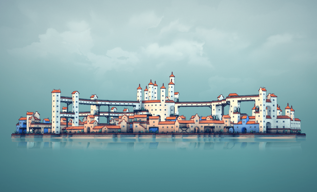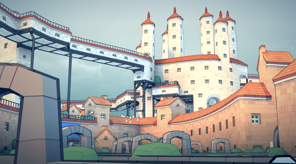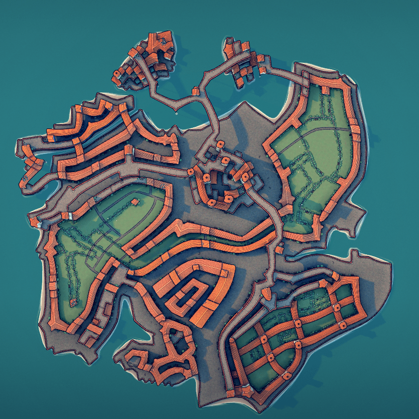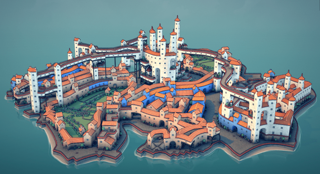 It features a central castle with seven towers and is connected through the city by elevated walkways. The castle is flanked by two large public parks, both connected by a greenway and a central commercial district.