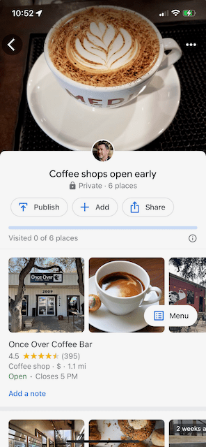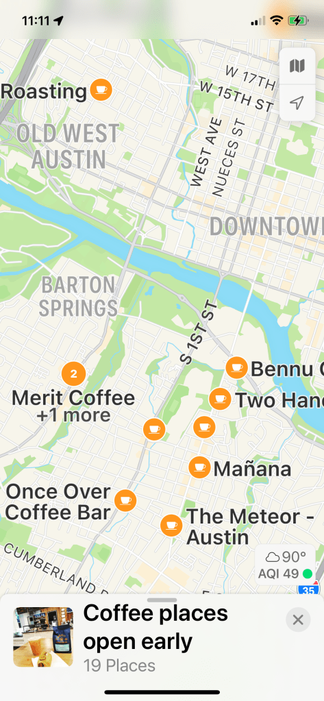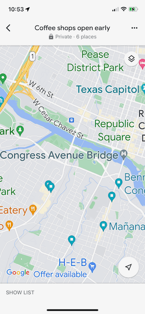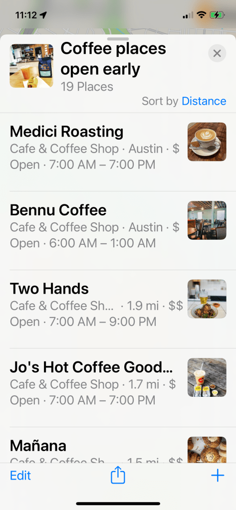 I just set up my own guide for coffee places open early for when I’m looking to get our early. Quick and easy and right to the point! 🤩. I can immediately see all the places I saved and their hours. Check it out for yourself! (This is my own personal guide, so it’s focused on Austin, TX.)
